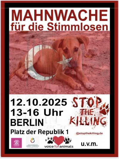 Am 12.10. versammeln wir uns in Berlin zur großen Mahnwache von Stop the Killing. Gemeinsam mit vielen Vereinen, Initiativen und Unterstützern setzen wir ein starkes Zeichen gegen das Massaker an den Straßentieren in der Türkei.